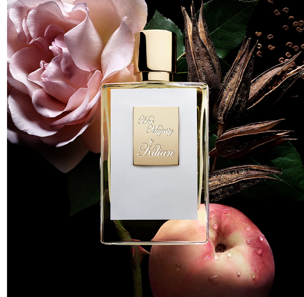 The perfume: Chypre, the emblematic accord born of citrus, florals and woods. With Her Majesty, KILIAN PARIS reimagines this exceptional signature, infusing it with a luminous and sensual modernity. At the heart, Rose Damascena absolute reigns, softened by tender peach and electrified by a breath of rum. Ambrette seeds unfurl its musky magnetism, warm and enchanting. In the dry down, papyrus and cedar etch a distinctly woody trail. A sovereign creation, in perfect harmony.